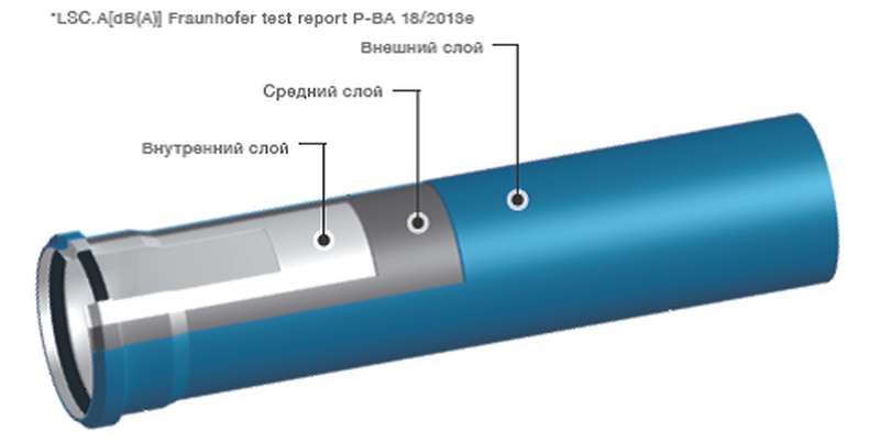 Средний слой - серый РР-С ММ, класс трубы B(SN4kN/m2), высокая плотность (высокая степень звукоизоляции), высокая прочность.